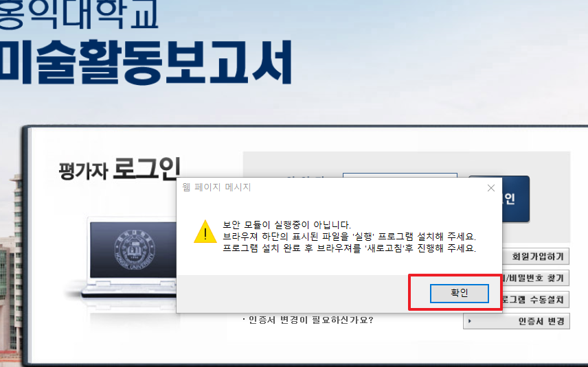 보안모듈 미 설치 시 안내사항에 따라 확인을 클릭하세요.