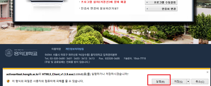 하단의 파일다운로드 안내사항의 "실행"을 클릭 후 설치 준비를 해주세요.