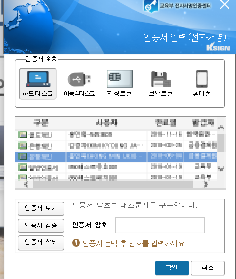 인증서 선택창이 나타나면 교원인증서 또는 공인인증서를 선택하여 로그인 해주세요.
